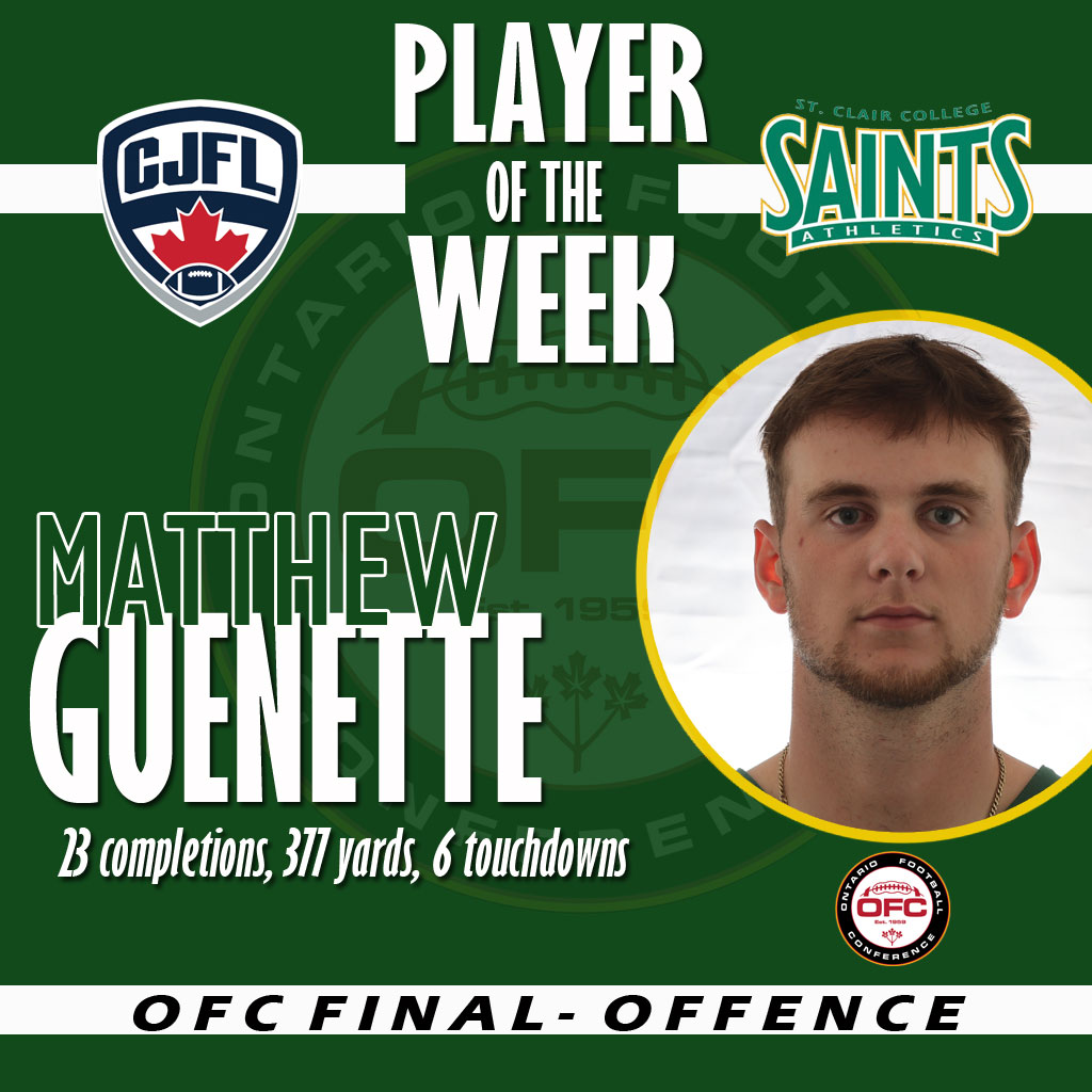After a long road back, Matthew Guenette returned to the helm of the Saints offence and delivered a masterful performance as the Saints continued their unbeaten season in a statement win that punched the Saints’ ticket to the Canadian Bowl. Guenette shredded the London defence as he completed 23 of 29 passes for 377 yards and six touchdowns and scampered five times for an additional 42 yards and had a touchdown.