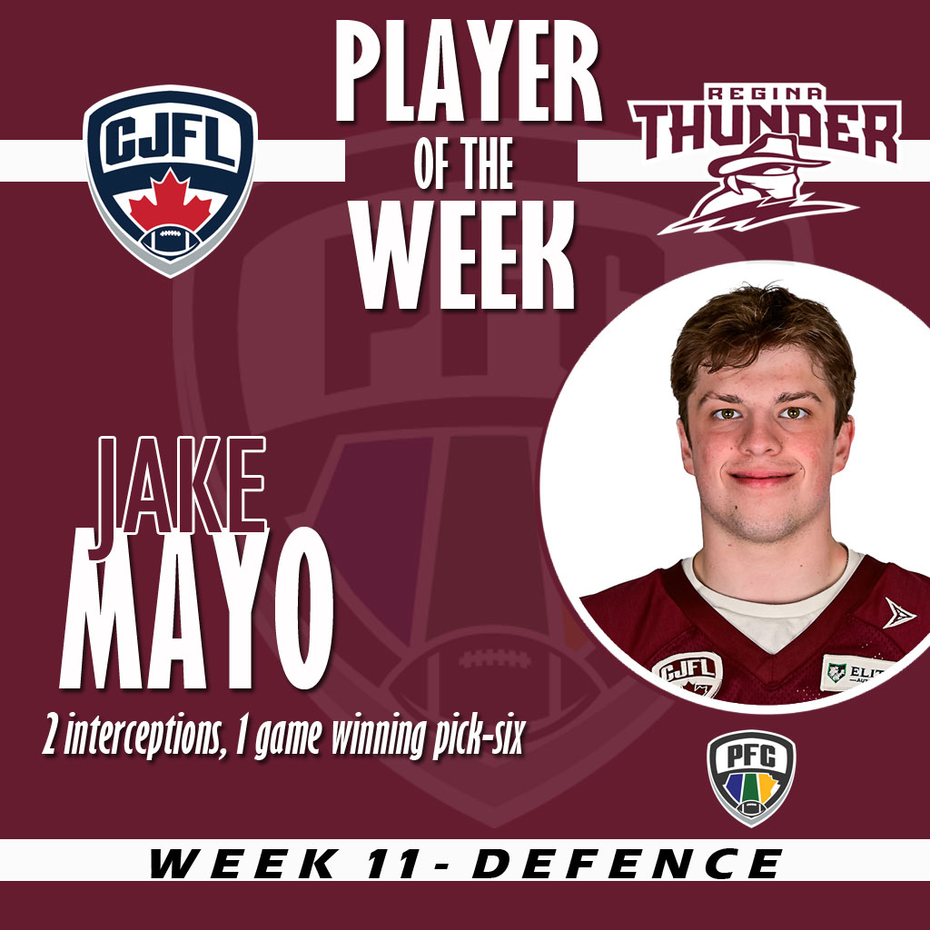 A 34-yard interception return for a touchdown with 2:44 left in the game from Jake Mayo helped the Regina Thunder move back into first place in the Conference. The pick was his second of the game to complement his four tackles and one knockdown, giving him the best defensive performance of the week.