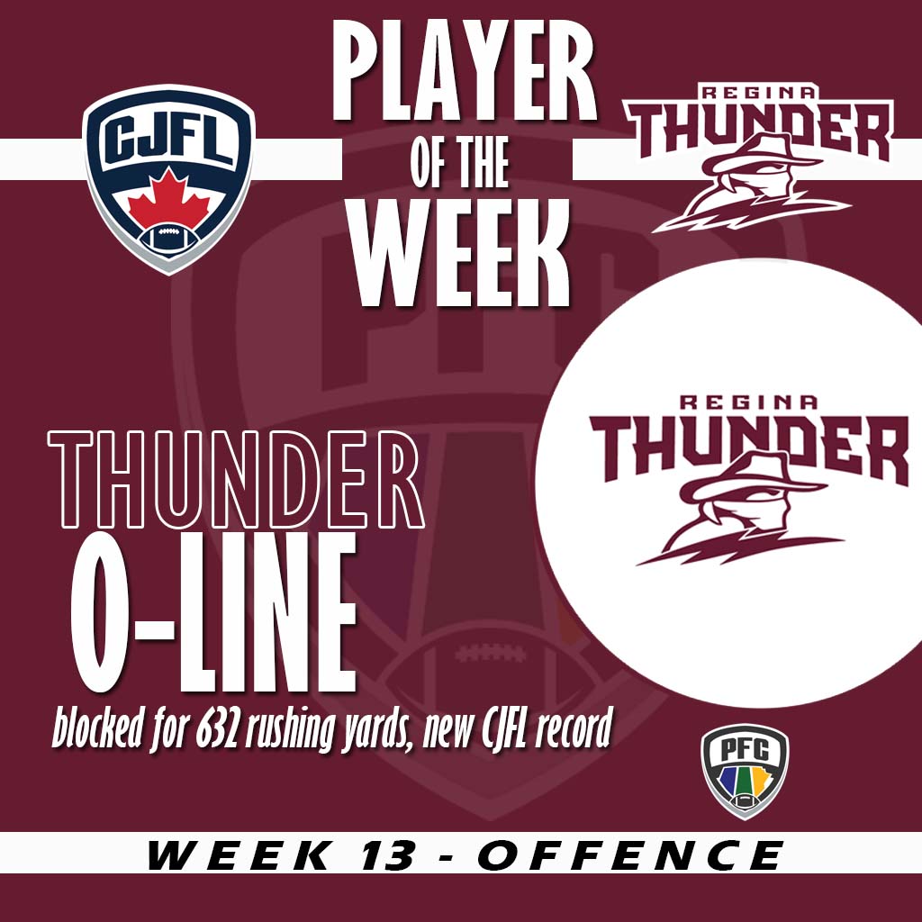 The offensive line for the Regina Thunder this past weekend etched their name into the CJFL Record Book after blocking their way to an eye-popping 632 yards of rushing on Thanksgiving Sunday. The combination of Caleb Barajas, Tristan Rapchalk, James Lucio, Nolan Finn and Ethan Kreulzer helped their running backs to a CJFL single game rushing record, smashing the old mark of 588 yards set by the Edmonton Huskies in 2002. Barajas added to the record production numbers with an 11-yard offensive lineman rushing touchdown!