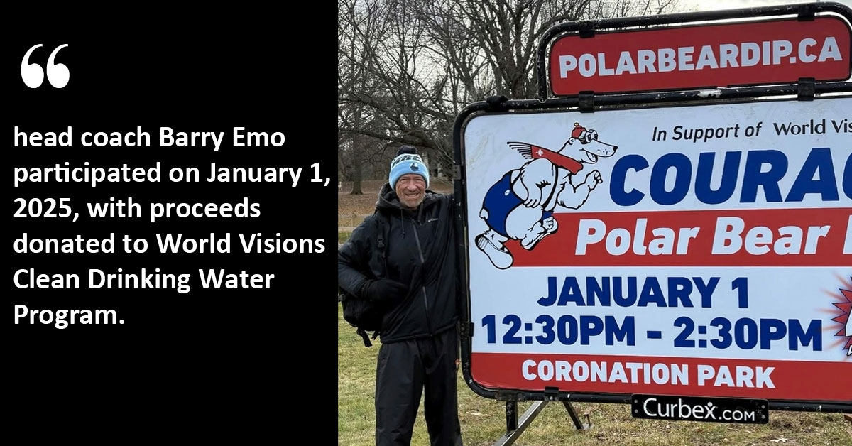 Oakville Polar Bear Dip – head coach Barry Emo participated on January 1, 2025, with proceeds donated to World Visions Clean Drinking Water Program.