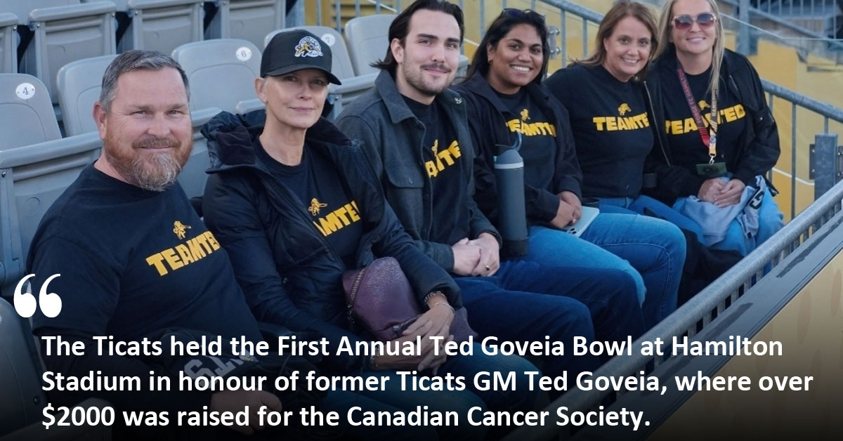 Finally, the Ticats held the First Annual Ted Goveia Bowl at Hamilton Stadium in honour of former Ticats GM Ted Goveia, where over $2,000 was raised for the Canadian Cancer Society.